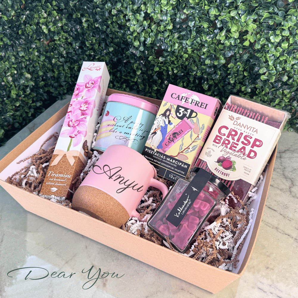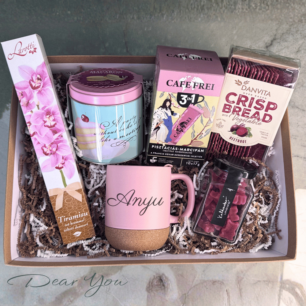 Minden termék magas minőségű, gondosan összeválogatott, ízben és hangulatban is harmonikusan illeszkedik egymáshoz: a pisztáciás‑marcipán kávé, a macaronok, az epres tea gumicukor, a tiramisu bonbonok és a céklás lapkenyér együtt nőies, játékos, mégis kifinomult élményt adnak. A csomag prémium, látványos csomagolásban érkezik, a személyre szabható rózsaszín bögre pedig gondoskodik arról, hogy az ajándék hosszú távon is emlékezetes maradjon – tökéletes választás születésnapra, névnapra, köszönőajándéknak vagy „csak úgy”, amikor egy kávérajongó hölgyet szeretnél valódi törődéssel megajándékozni.