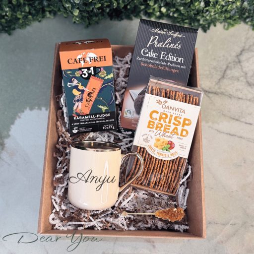 Ez a csomag igazi ínyenc választás kávérajongó, sós‑édes finomságokat kedvelő hölgyeknek: krémes karamellás kávé, gazdag étcsokoládé és mediterrán hangulatú ropogós lapkenyér találkozik benne egy elegáns, személyre szabható bögrével. A középpontban egy bézs színű, belül is bézs, arany peremű és arany fülű kerámiabögre áll, modern, ívelt formával. 300 ml‑es űrtartalma ideális egy kiadós kávéhoz, és személyre szabott felirat kerülhet rá – névvel, kedves üzenettel vagy különleges dátummal, hogy az ajándék valóban az ajándékozottról szóljon.