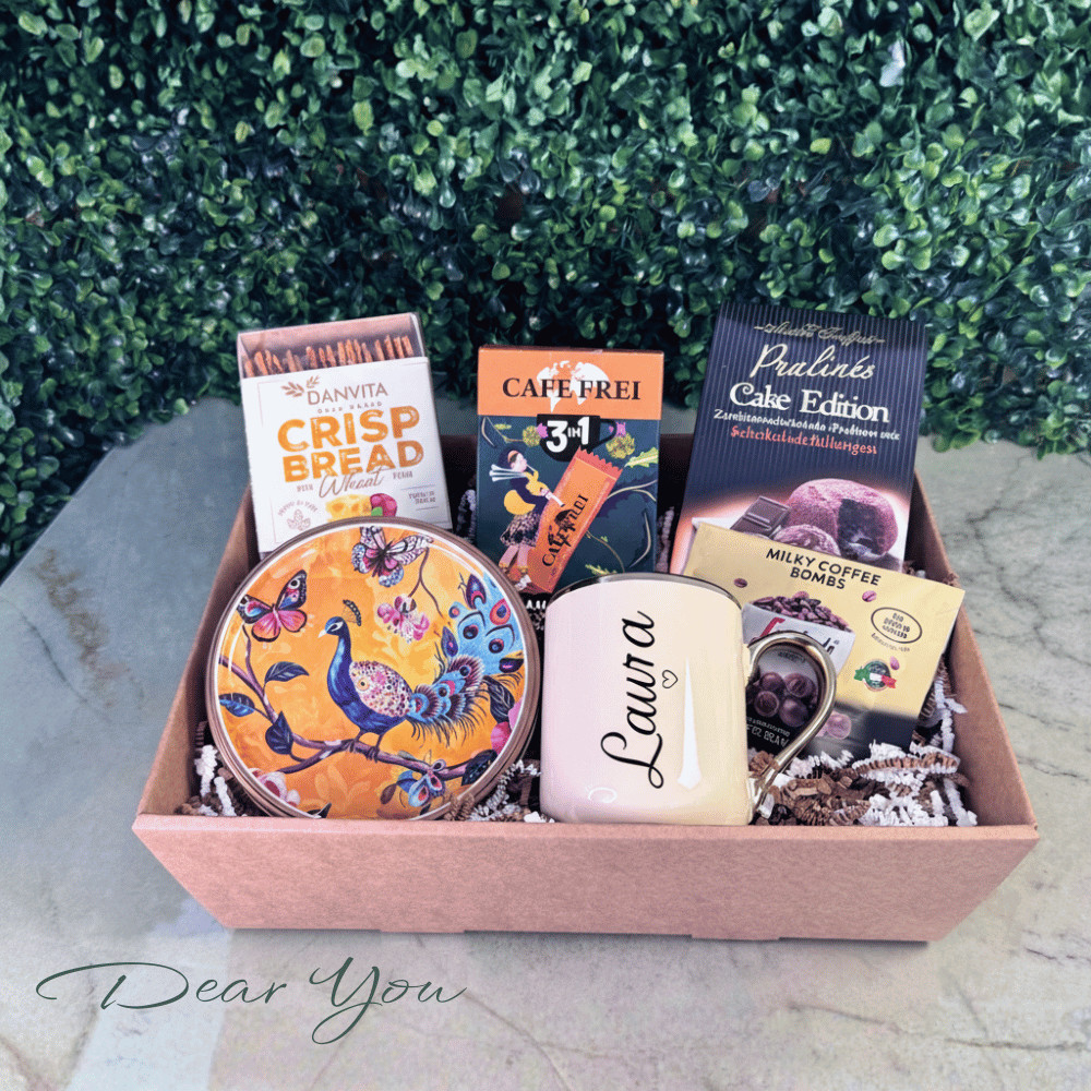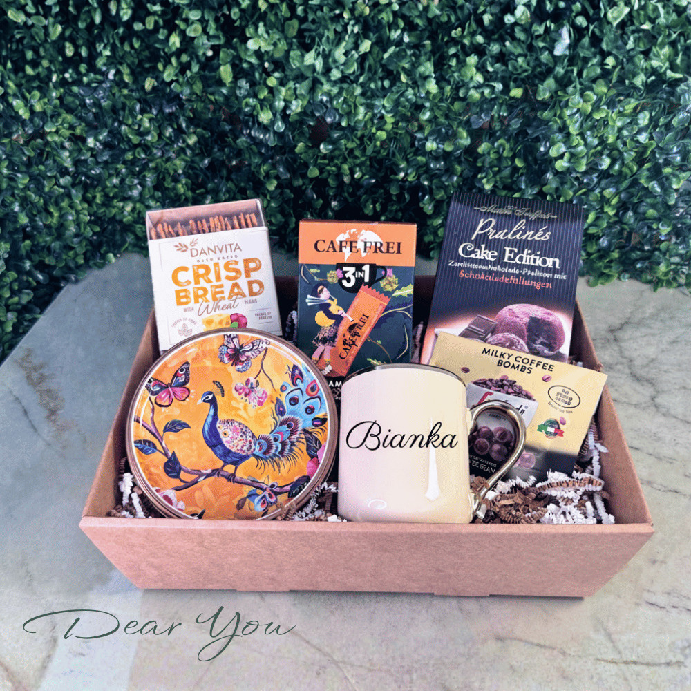 Ez a gondosan összeállított ajándékcsomag igazi élmény egy kávét kedvelő hölgynek: minden termék ízben, hangulatban és megjelenésben is rímel egymásra, hogy egyetlen csomagból teljes, kényeztető kávés pillanat szülessen. A csomag középpontjában egy bézs, belül is bézs színű, arany peremű és fülű kerámiabögre áll, elegáns formával, amely önmagában is dísze az asztalnak, és amelyre egyedi felirat kerülhet – így az ajándék teljesen személyre szabható, névre, üzenetre, alkalomra hangolva.